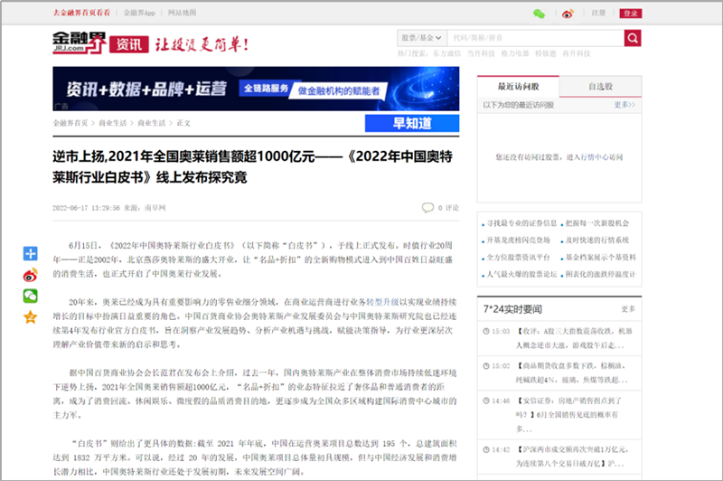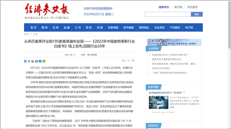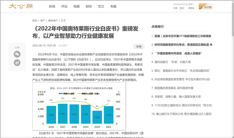2022年6月15日,中國百貨商業(yè)協(xié)會(huì)奧特萊斯產(chǎn)業(yè)發(fā)展委員會(huì)線上直播發(fā)布《2022年中國奧特萊斯行業(yè)白皮書》。白皮書中“2021年中國零售市場最新發(fā)展、中國奧萊20年全覽、2021年中國奧萊市場發(fā)展、中國奧萊展望和政策建議、專家訪談”等內(nèi)容吸引政府領(lǐng)導(dǎo)、專業(yè)機(jī)構(gòu)、產(chǎn)業(yè)運(yùn)營商、品牌商、服務(wù)商、媒體記者及眾多奧萊消費(fèi)者共計(jì)20余萬人參會(huì),成為國內(nèi)奧萊行業(yè)年度一大焦點(diǎn)。