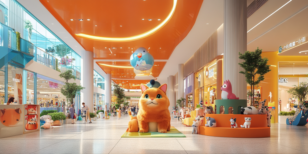 A場景:位于寵物友好購物中心一層,連接室內(nèi)外區(qū)域有家寵物零售店,店門口提供寵物推車,貨品陳列展臺(tái)尤其是寵物玩具類展臺(tái)略高于寵物推車,與寵物視線基本持平。店鋪店員自帶友好氣質(zhì),對來訪寵物的主動(dòng)親親貼貼毫無抵抗力。店內(nèi)到處可見主人們各自推著小車帶著貓貓狗狗,三三兩兩聚在一起聊著自家寶貝的名字、習(xí)慣與性格。直接進(jìn)入商場或從店鋪進(jìn)入商場都無需回避安保人員的“眼神拷問”,符合城市飼養(yǎng)規(guī)范的寵物均可自由進(jìn)場。