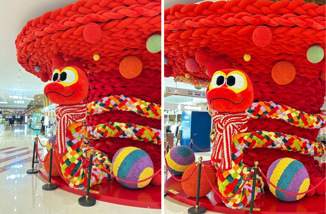 在即將到來(lái)的蛇年,購(gòu)物中心開(kāi)始陸續(xù)安排上了蛇年美陳。北京世紀(jì)金源購(gòu)物中心也不例外。它選擇將毛線與蛇元素相結(jié)合,帶來(lái)一棵神蛇許愿樹(shù)。整棵樹(shù)都由毛線編織纏繞而成,五彩斑斕的神蛇盤(pán)繞許愿樹(shù),還給自己帶上了一條圍巾,略顯可愛(ài),也不失喜慶的氛圍。