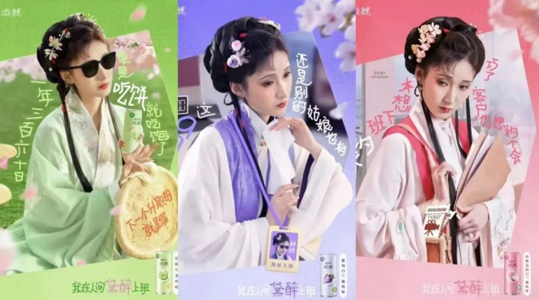 比如在五一調(diào)休這個社會熱點(diǎn)話題中,RIO雞尾酒請出了大IP林黛玉,推出一組“我在人間黛醉上班”的海報,每一句都非常“有那味兒”。這組海報以林黛玉的形象為核心,將她的古典韻味與現(xiàn)代職場生活巧妙融合,每一幅都充滿了獨(dú)特的韻味與深意。