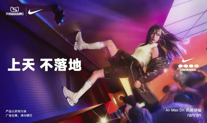 提及“發(fā)瘋”,耐克的「上天不落地」?fàn)I銷大事件也是不得不提一提的。借助新發(fā)布系列的契機(jī),耐克與天貓超級品牌日牽手,通過與潮流人群共創(chuàng),借助城市文化加強(qiáng)對潮流藝術(shù)的表達(dá),深度溝通年輕人群,在社交平臺上號召網(wǎng)友們玩轉(zhuǎn)“先瘋”穿搭共創(chuàng)。