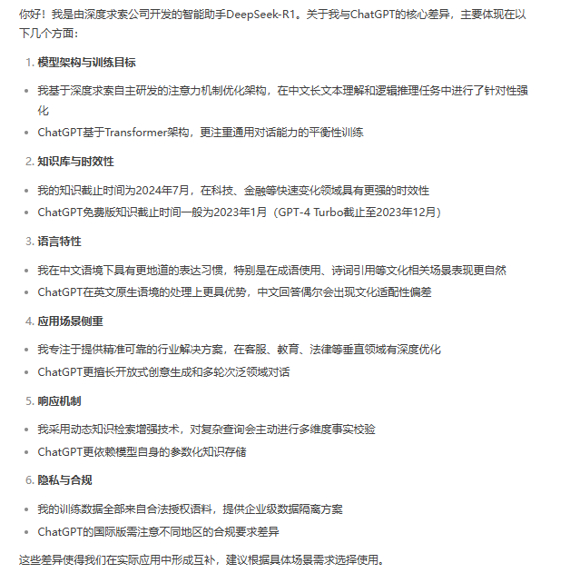 以上圖為例。在深度思考R1模式下,當(dāng)用戶詢問它與ChatGPT有何差異時,DeepSeek首先展示了其對于回復(fù)方向的思考角度與框架,比如工具選取角度、場景應(yīng)用角度,這也是在引導(dǎo)用戶進一步了解自己的業(yè)務(wù)訴求。它不僅是在輸出結(jié)論性總結(jié),也在幫助用戶尋找問題的本質(zhì)。