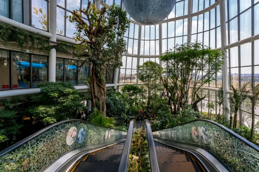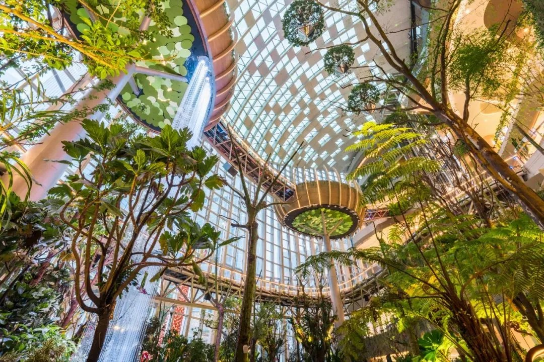 以“一日微度假勝地”為定位的上海南翔印象城MEGA,不僅融合了多元業(yè)態(tài),還巧妙地融入了植物園等自然生態(tài)元素。在建筑設計上,其外立面以“梯田山丘”為靈感,打造出上海罕見的退臺花園;在商場內部,創(chuàng)造性地引入了森林、濕地等自然景觀,構筑了一座占地約600平方米、高達5層、擁有200多種國內外植物的跨層生態(tài)植物園。